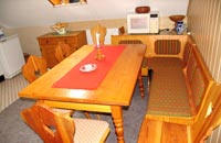 großen Eckbank, Kühlschrank und Kaffeemaschine.