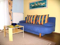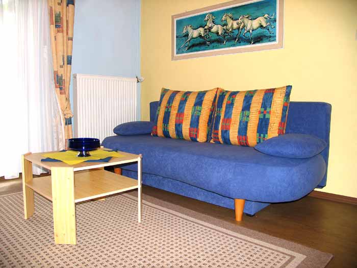 Im Wohnzimmer mit Balkon gibt’s neben der gemütlichen Couch